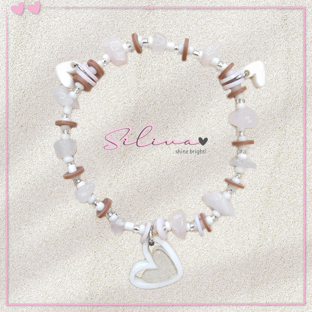 Deze armband maken we met 2 kleine hartjes van wit en een combinatiehartje van wit/transparant bruin.